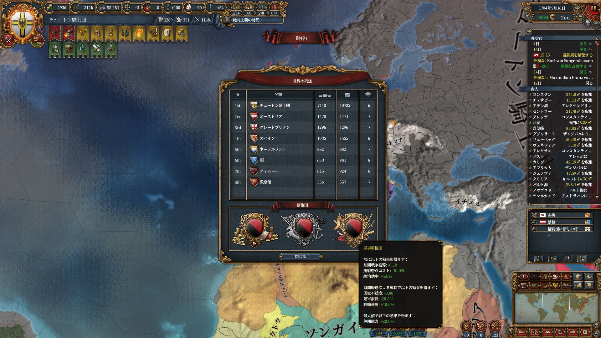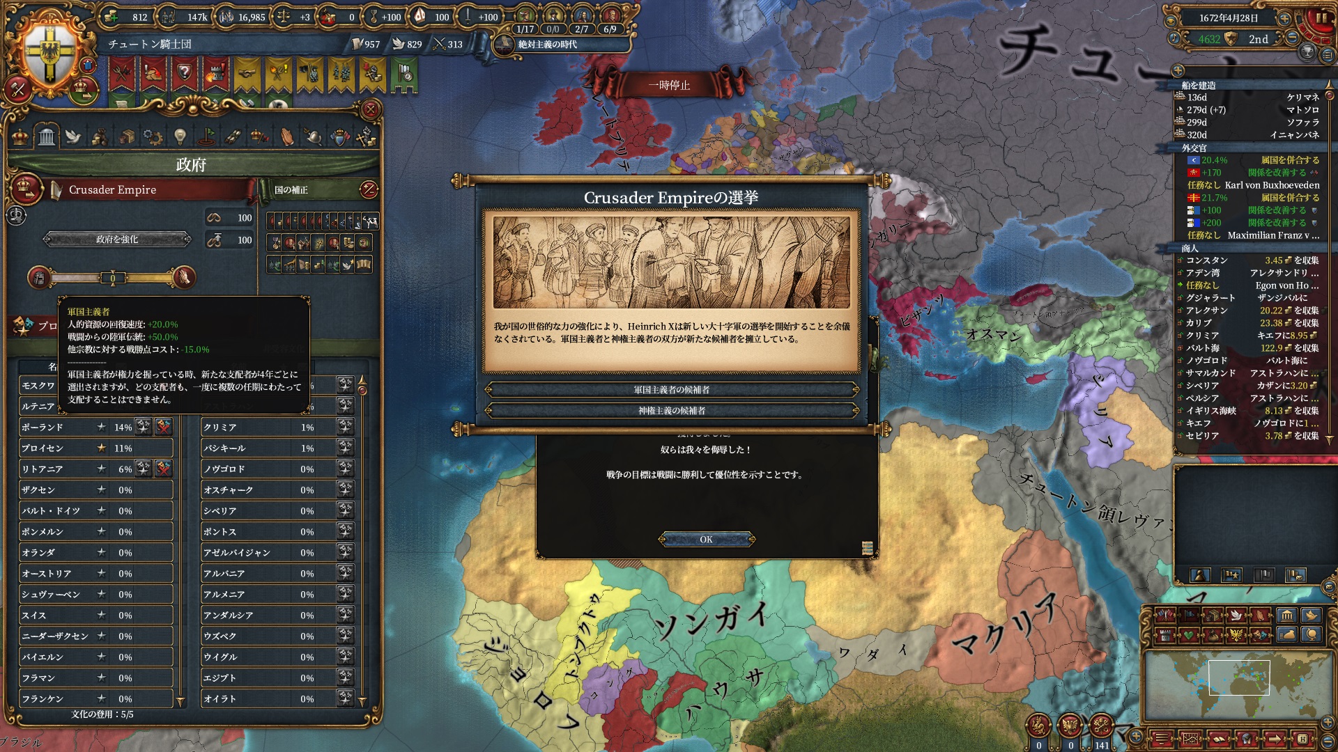 溢れる君主点で特権がいらない事にようやく気付いた神権制Tier9を"神の導き(最大絶対主義+15)"から"公選の実施"に変更。