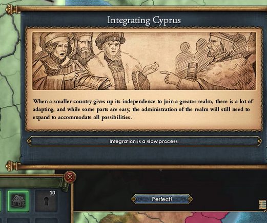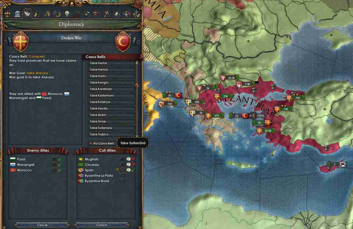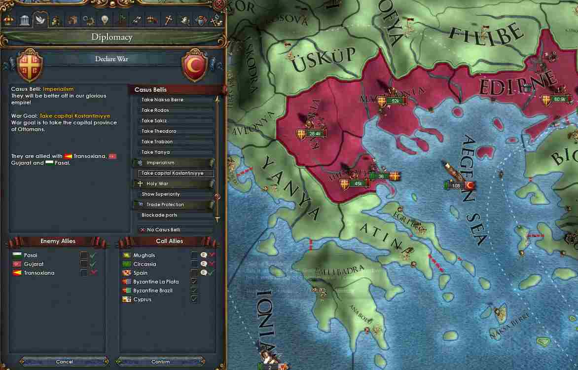 とりあえず、Basileusで必要なので戦争の前にキプロスと同盟して外交属国化。あとで併合します。これによりBasileusに必要なプロビは現時点ではすべてオスマン(とビザンツ)が持っていることになるので、とりあえず複数の大国を相手に戦争する状況にはならなそうです。