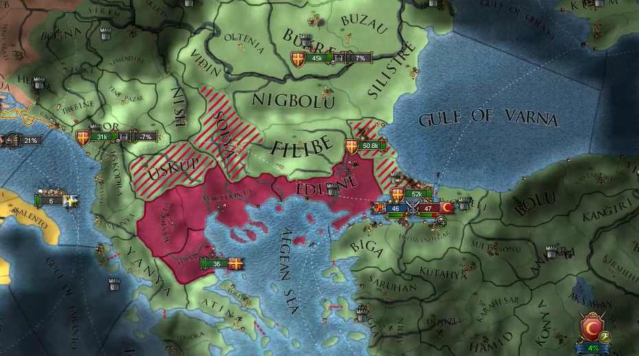 そうこうしているうちにバルカン半島側ではビザンツによる占領が進みます。ぽこぽこオスマン軍が現地徴集していますがなんの力にもなっていません。