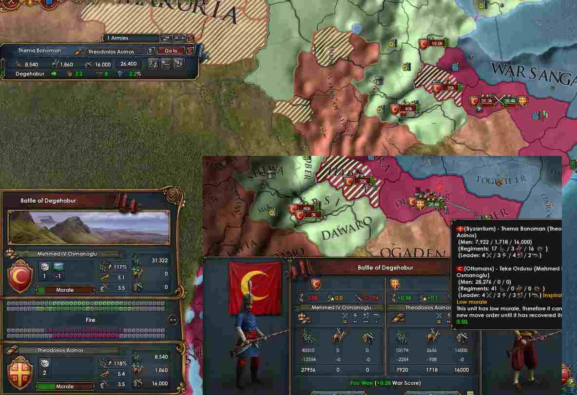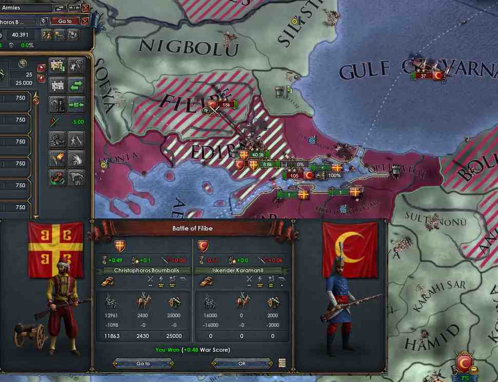 よく見たら今回の戦闘で出てきたオスマン軍はすべて歩兵で、砲兵が0でした。それに地形補正も合わさってなんとビザンツ側が数的不利を脱し勝利。やっぱり砲兵は重要ですね・・・