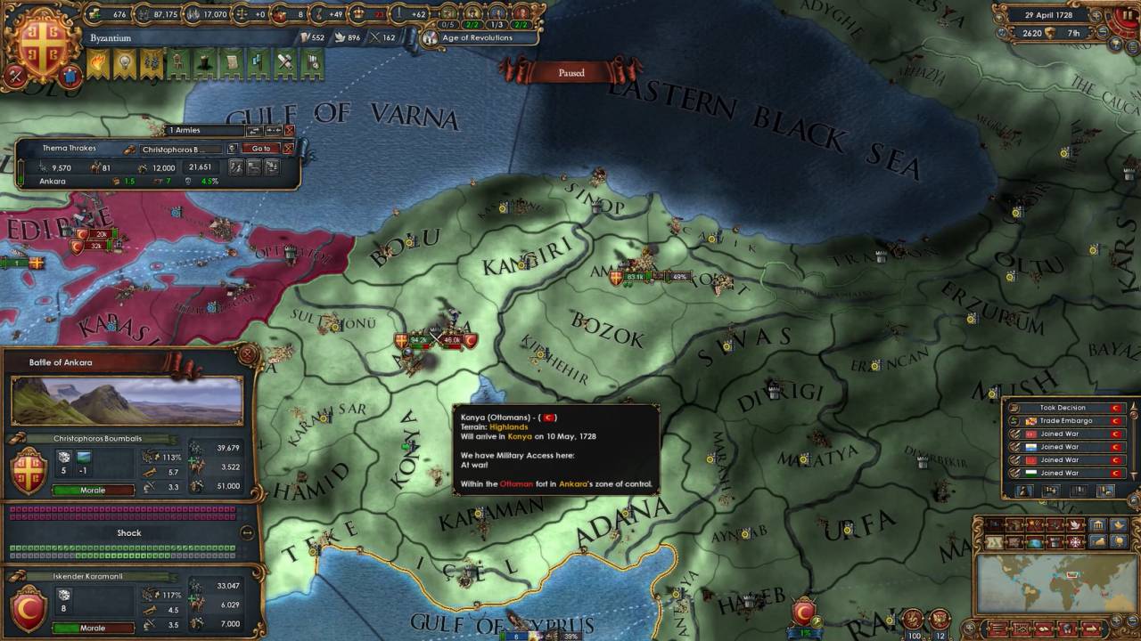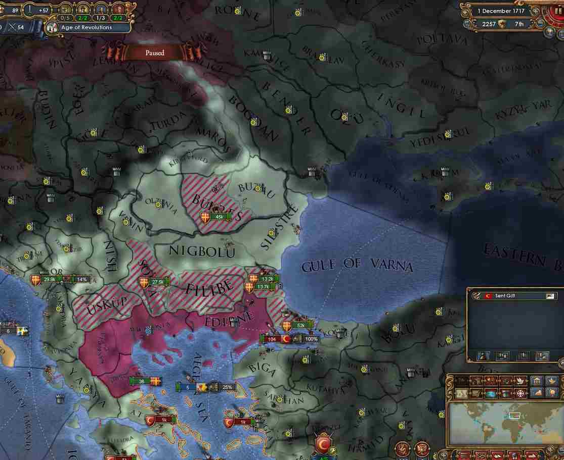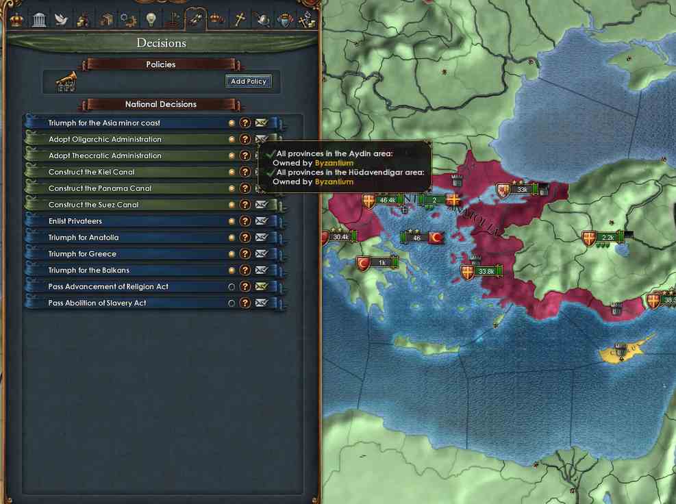 これ、Basileusの実績を獲得するうえではかなり重要な要素で、クリミア半島はゲーム中は基本的にロシアの勢力圏にあります*3から、ここを取るということはロシアと敵対化する可能性がかなり大きくなります。また、状況によってはすでにオスマンがクリミア半島をロシアに奪われていることもあり、その場合にはオスマンとロシアの2大国を相手にしなくてはなりません。こうなると難易度は大きく上昇します。