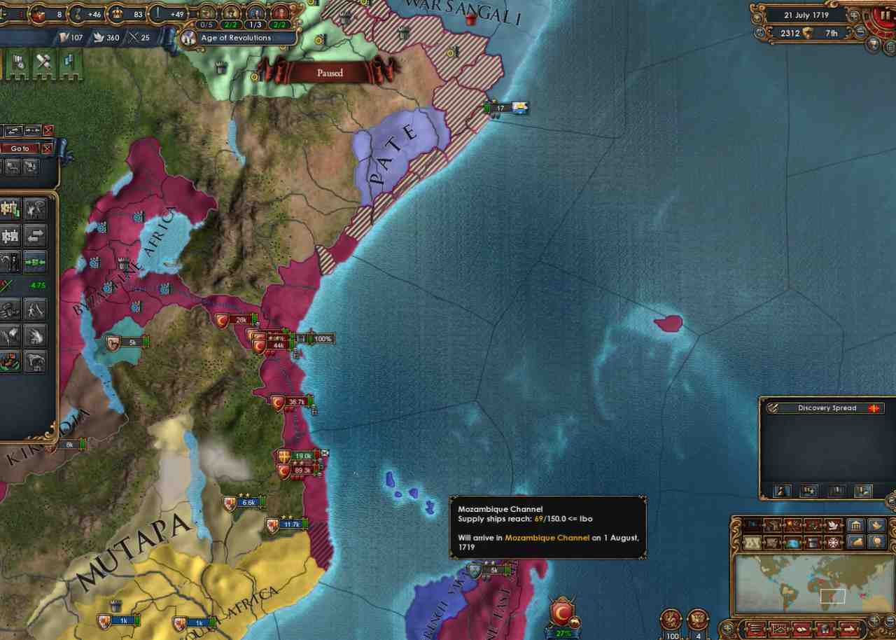 この戦争の後に首都をCape VerdeからConstantinopleに移転。ついでに時代ボーナスを手に入れるためDevを44から50まで伸ばしました。さらにConstantinopleトレードノードでCollectがまともにできるようになったので収入も爆上がりします*17。