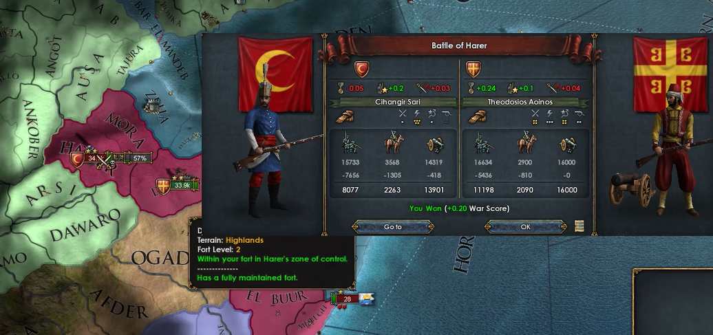 初戦闘はHarerにて、以前プレイヤーが山要塞を作ったところなので要塞が陥落するまでは地形上ビザンツ側が優位になりますが・・・戦闘を仕掛ける前に占領されてしまった。それでも直後に行われた戦闘にはビザンツ側が勝利しました。