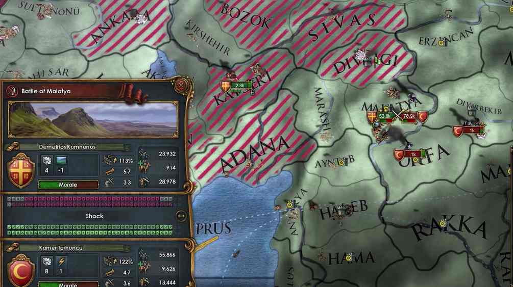 ひえ~ぶっちゃけグロい。およそ250Kの軍隊がビザンツ領の要塞になだれ込んできます。対して迎え撃つはビザンツ軍36K。勝てないから逃げろ。