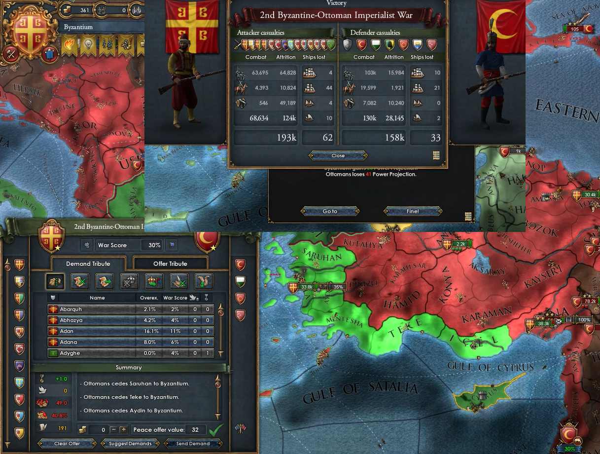 途中でオスマン軍の規律が5%上がったため苦戦を強いられ、本当はもう少し戦勝点を取りたかったのですがやもなく講和。それでも戦勝点30あるので十分か。