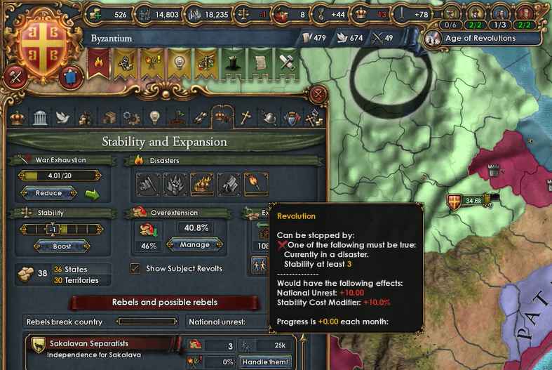 イベントでStabilityが下がったらトリガー引いちゃった。今回はイベントではなくDisasterによる革命で、これを起こすとなかなか大変なことになります。起こそうと思えば起こせたがさすがにこんなことをやって今までの努力をおじゃんにしたら何も言えないので今回は革命無しの方針で。後から考えたら革命を起こしてもロールプレイ的にはよかったかなと。ビザンツの旗がどうなるのかも結構気になるし