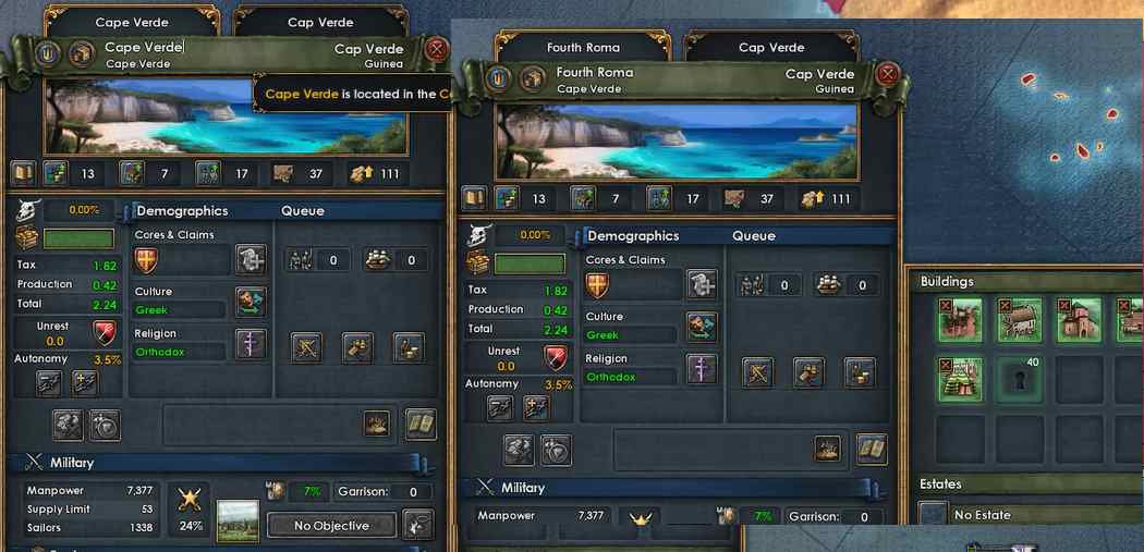 ここはオスマンの首都であり、かつDevが44(13/22/9)もある*6ので必要な戦勝点も比較的高いですが、ゲーム最序盤でプレイヤーが要塞を壊したっきりになっており、無力なレベル1要塞しか存在しません。したがって、Imperialism CBを使ってささっとここを占領し戦勝点を稼ぎます。