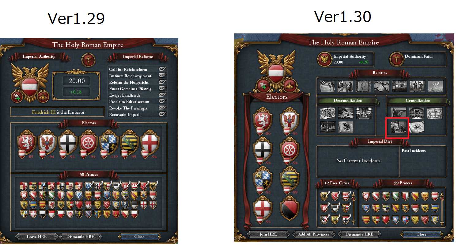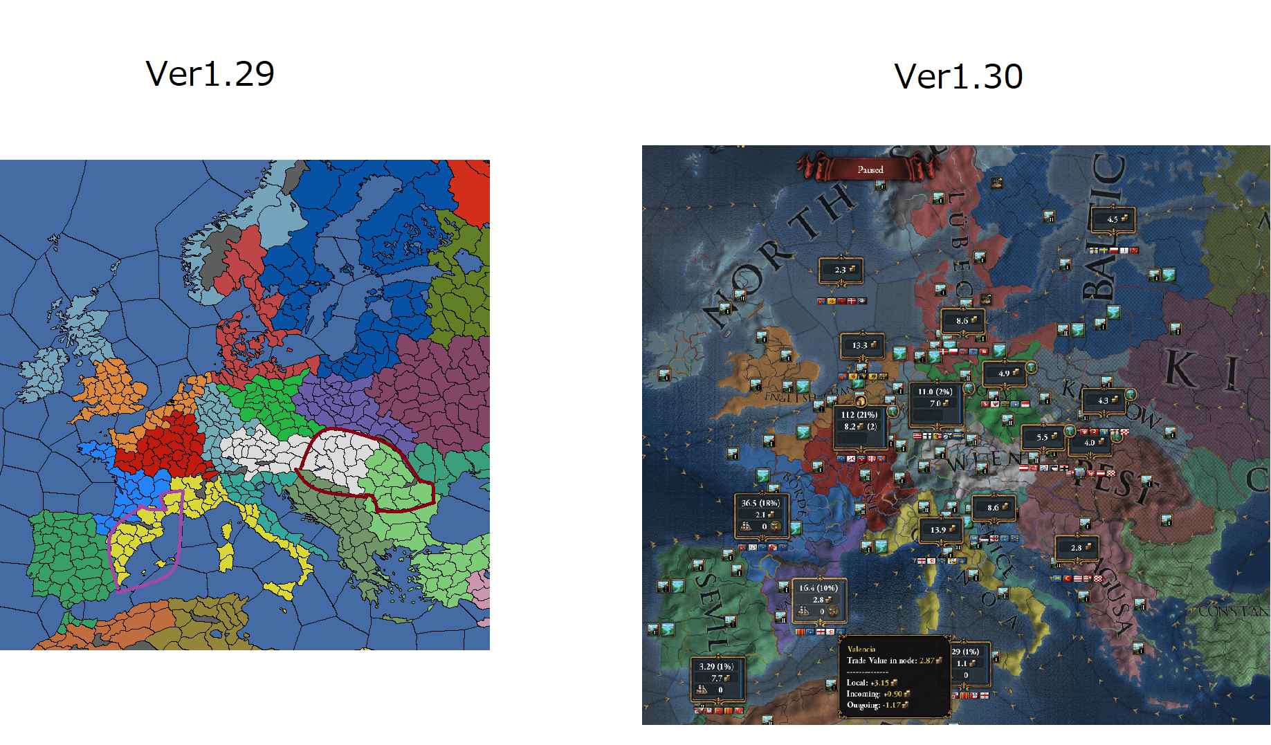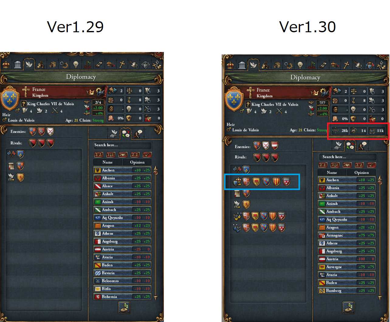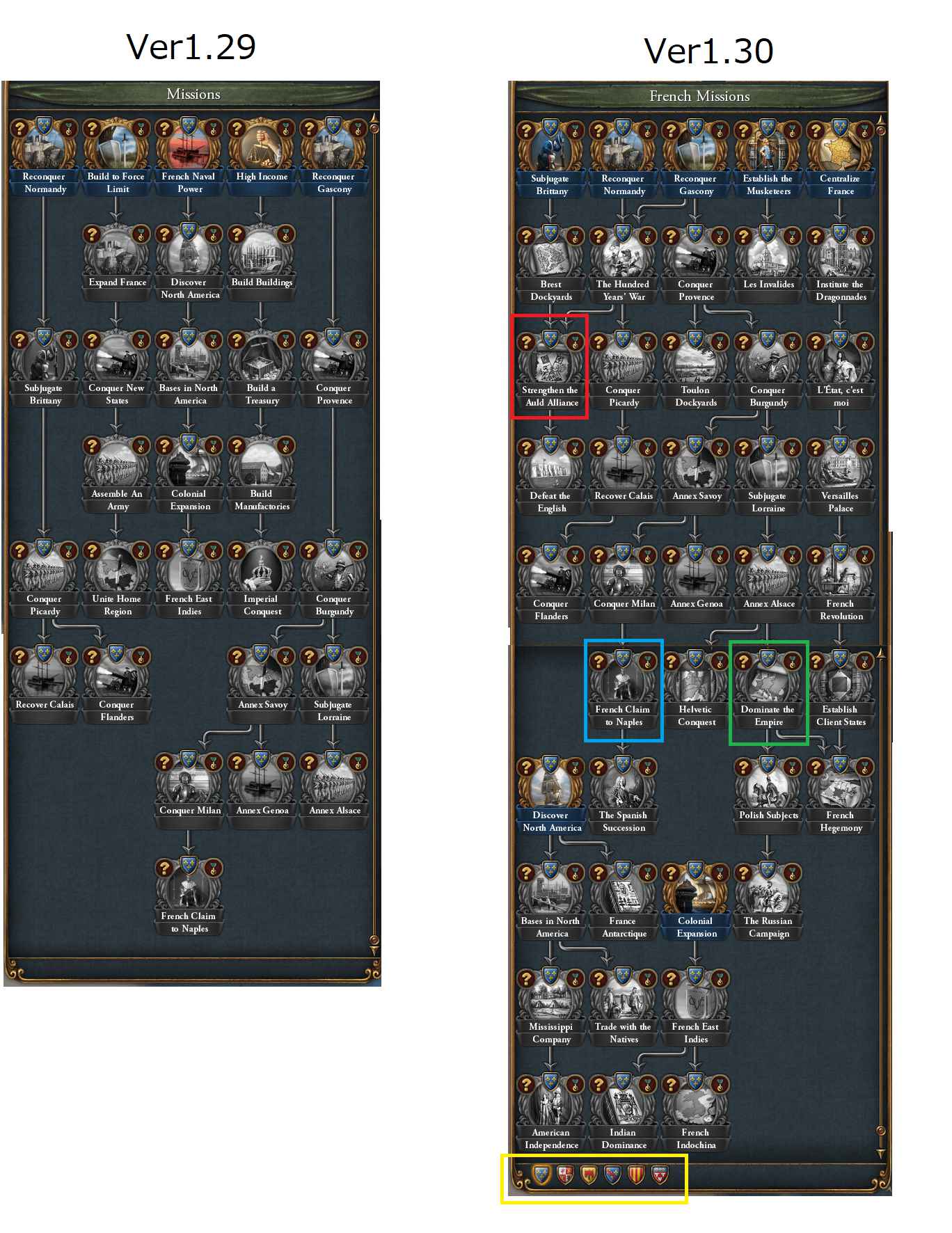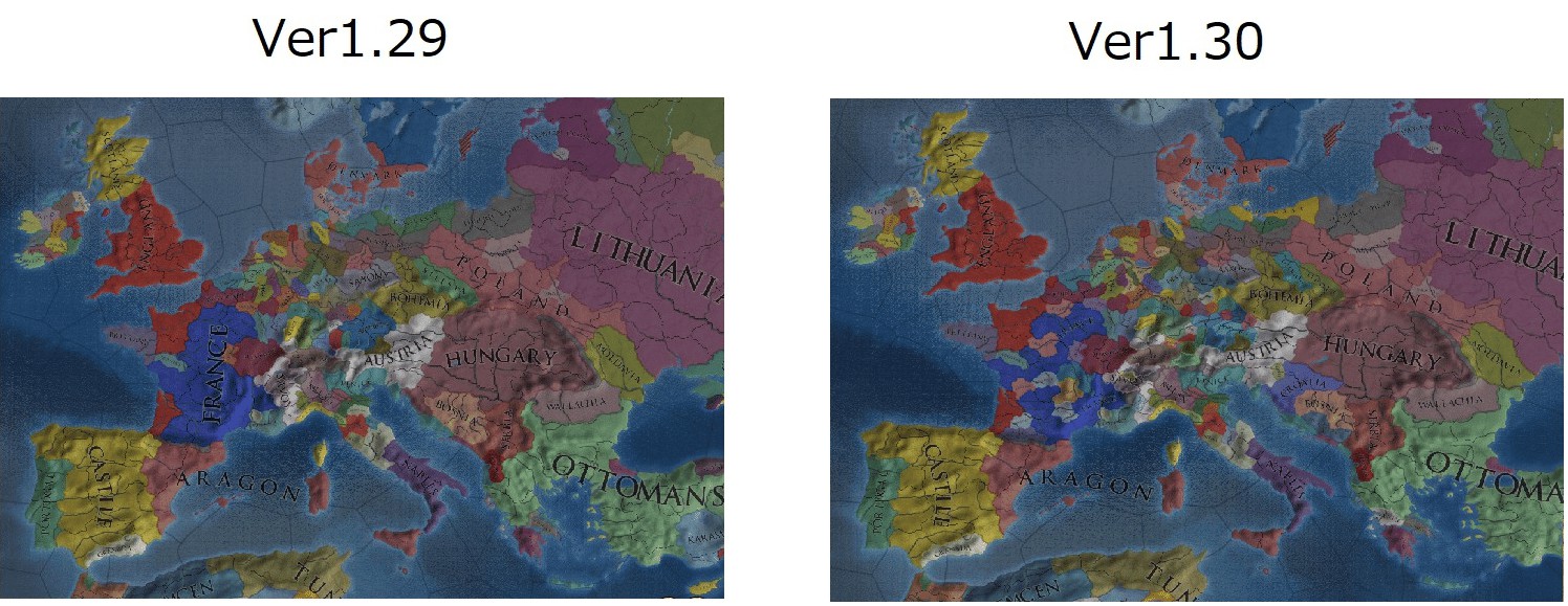 ここではGC開始時のFranceについてVer1.29とVer1.30のSSを比較し、主な新要素や変更点について分かる範囲で大まかに解説する