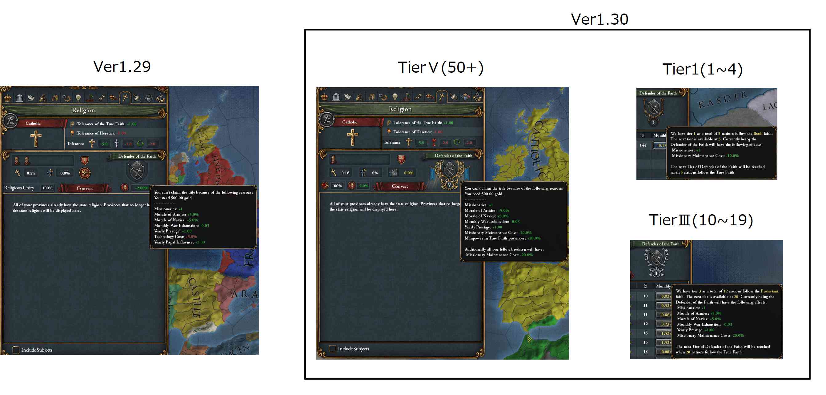 その宗教を国教とする国の数に応じて、信仰の守護者がTierⅠ~TierⅤに振り分けられボーナスの効能に差がつけられた