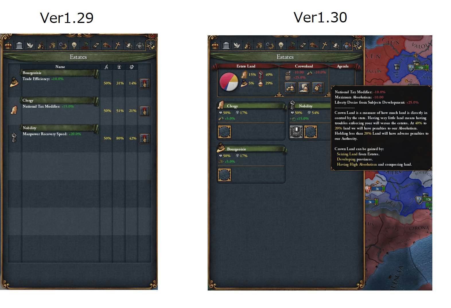 イベントやPrivileges(特権)の授与/剥奪を通じてCrownland(王領?直轄領?)とEstate_Land(階級領?※仮想的なもので実際の州とは無関係)の割合が変化する