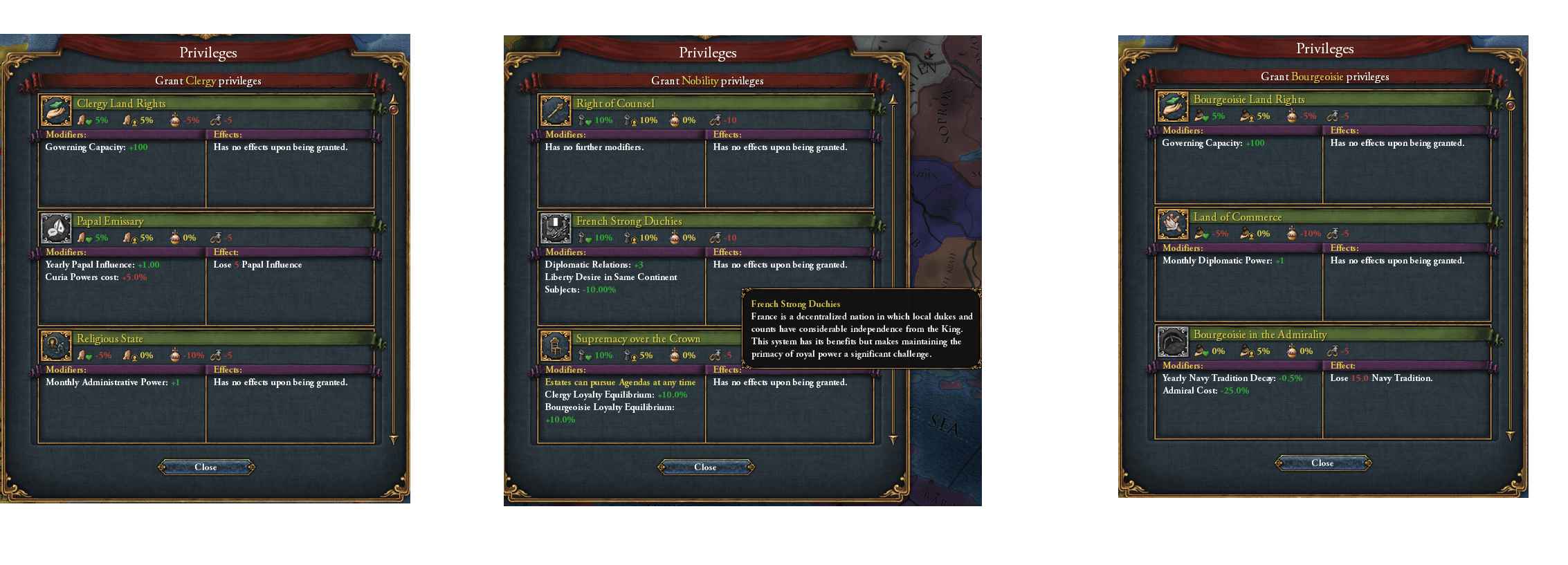 利用可能な特権の種類には上記の君主点のように(おそらく)普遍的なものもあれば、画像中央の"France_Strong_Duchies"(フランスの強力な公爵達?)のように国や文化、宗教による特殊なものもあるようだ