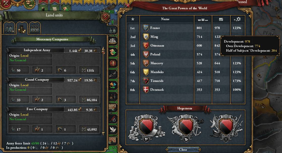 一例を挙げると右の軍事覇権の前提は1000連隊(百ではない)の保有である。参考までに、Mughalで世界征服した六芒星の夢のゲーム終了時の保有兵力が827kだった