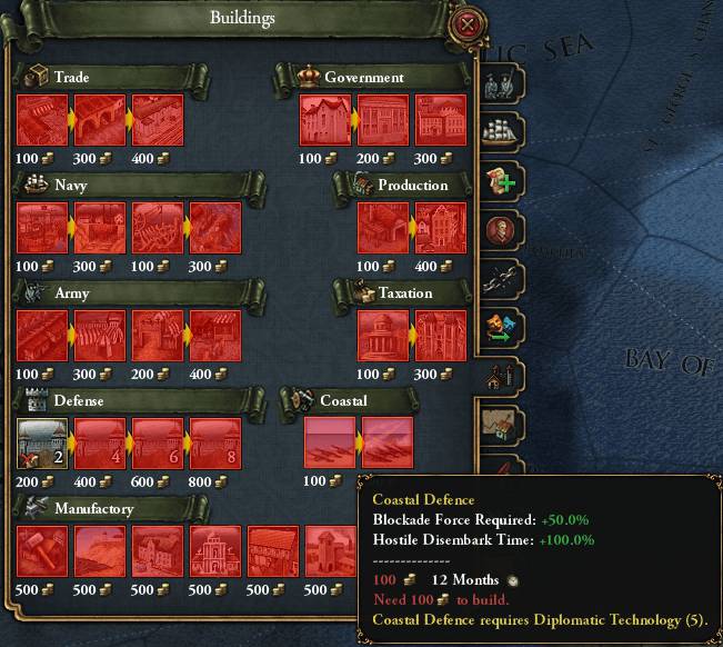 外交技術Lv12になると"Coastal_Defence"(沿岸防衛)を"Naval_Battery"(海軍砲台?対艦砲台?)へとアップグレードでき、効果が敵対的上陸に要する時間+200%(加えて敵艦隊の損耗+5)に強化される