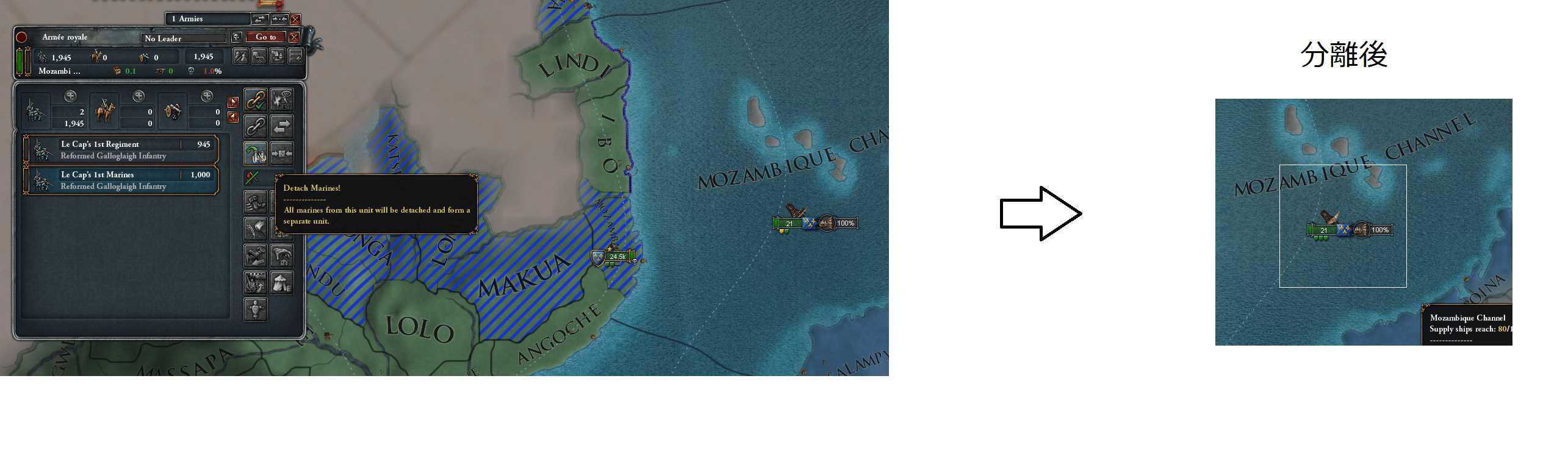 この同乗している状態は内部的に不安定のようで、検証中に海兵隊が消失するバグ?に遭遇した。操作内容は洋上で海兵隊を分離後に ①海兵隊のみでIBOに上陸を企図②通常部隊のみでIBOに上陸を企図③艦隊をMOZAMBIQUEに入港④セーブ&ロード、の4種類全てで消失を確認 いずれも戦闘なし、通常の部隊に置き換わった様子も水兵プールへの還元もなしで純粋に海兵隊1連隊のみが消えた。あくまで"2部隊の同乗"が問題のようで、 海兵隊単独(そもそも結合せず海兵隊のみで乗船)の場合、混成部隊のまま洋上分離しなかった場合、通常部隊のみの場合 の3パターンで①~④を試したが、いずれも海兵隊の消失は起こらなかった。また陸上で混成部隊を分離→海兵隊のみ隣州に移動でも消失しなかった 貴重な水兵を無駄にしないためにも、洋上での分離は避けた方が良いだろう