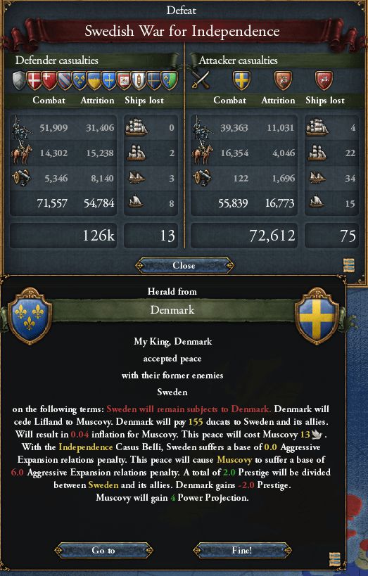 1537/09 Denmarkに対するSwedenの独立戦争が終了。Denmarkは敗れたがSwedenはDenmarkの従属国として残った