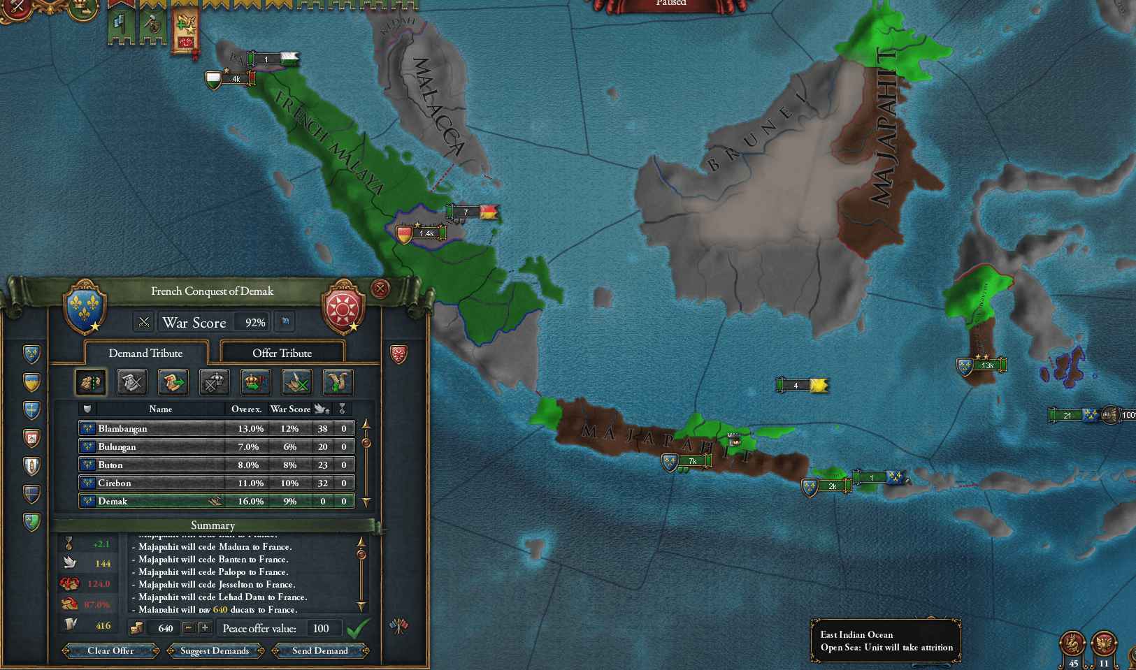 陸上部隊は予め上陸させておいた。Malaccaも征服するつもりで共戦国に指定したが、敵陣営の海軍が予想より多く海峡の渡河ができなかった 敵陸軍総数57kに対して準備したのは20k強(輸送中に損耗していた)だったが、AIがあまり連携せず戦力を逐次投入してきたためさほど苦戦しなかった 余談だが世界地図を知っているプレイヤーであればこそ、未知領域の敵相手でも目算を立てられるものの 実際に現地で戦う兵士からすれば「正気の沙汰ではない」と感じても仕方ない