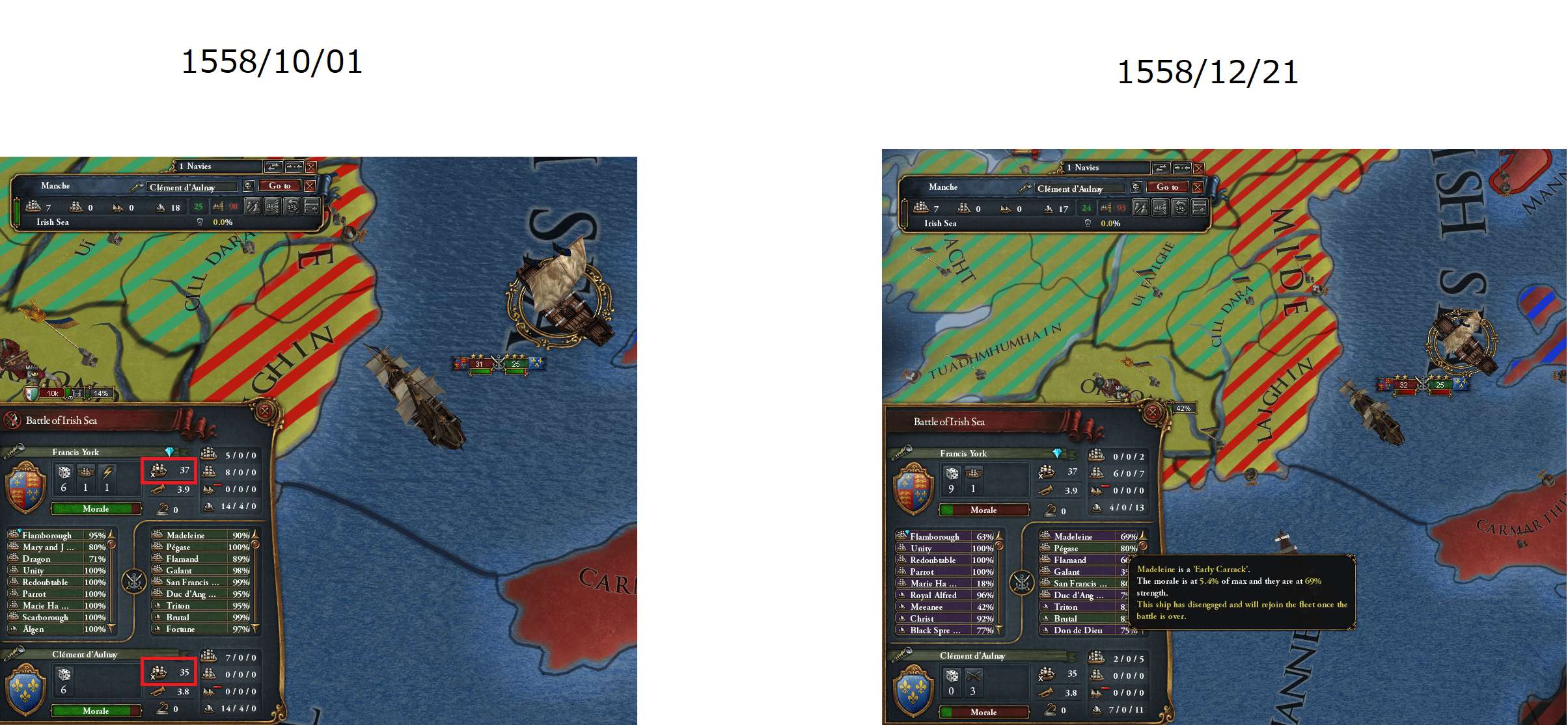 今回は外交技術・海軍伝統・指揮官の能力に加え艦船数(に伴う砲門数)が同程度だったので、戦闘が長引いて引き分けに近い結果で終わったのだろう