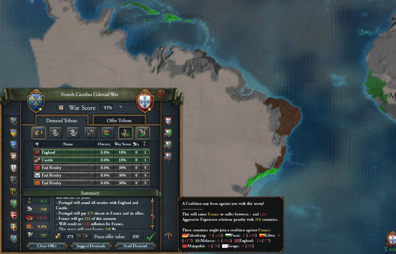 植民地主義CBの仕様を勘違いしており、不適正な要求で大量のDIPを浪費してしまった 単純に新大陸やGC開始時の未入植地全てを対象にしていると思い込んでいた よく考えればAE25%・戦勝点コスト50%でそれら全てが対象になるなら、バランス崩壊するレベルの便利すぎるCBになる