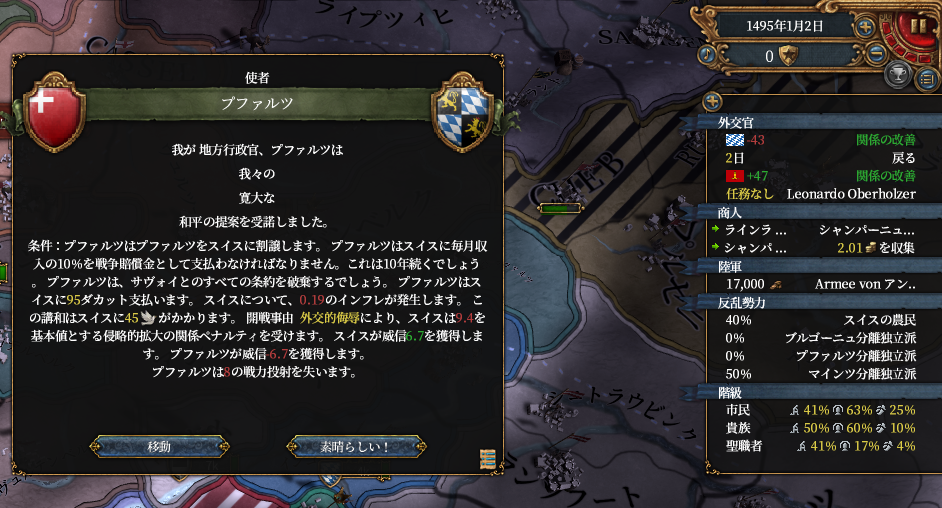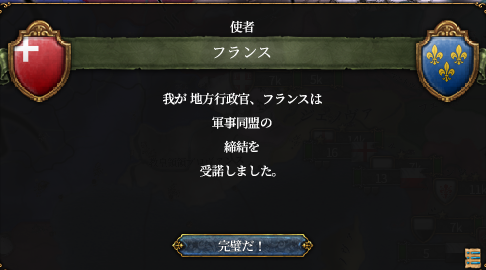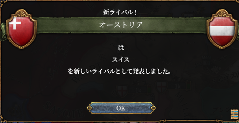 皇帝バフがとれて軍事力の低下したオーストリアにライバル視されました。これまではオーストリアにAEが飛んでも関係改善で何とかなっていたけどここからはそれが通用しなくなります。プファルツ公の皇帝就任はさらなる波乱を巻き起こし