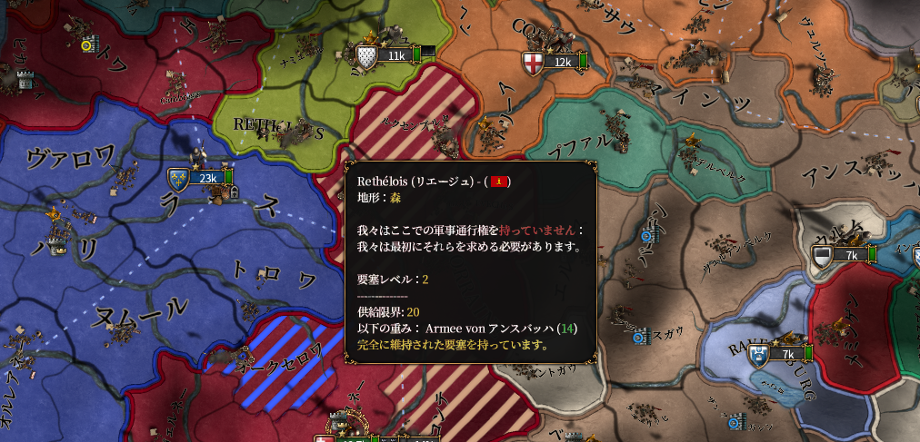 敵同盟国のトリーアも北進の邪魔になるので一緒にひき潰します。とはいえこれはフランスが来る上ブルゴーニュはリエージュなどのHRE国家と戦争中なので余裕も余裕、どぅんどぅん占領していきます。