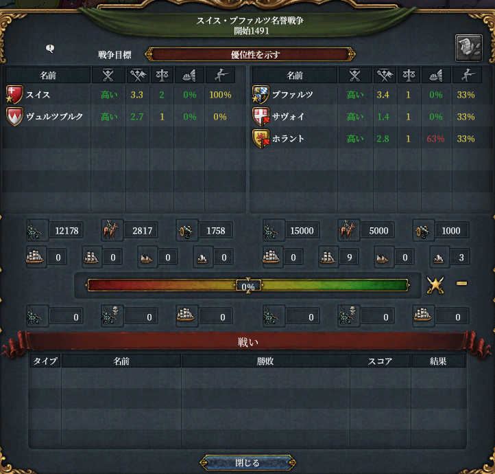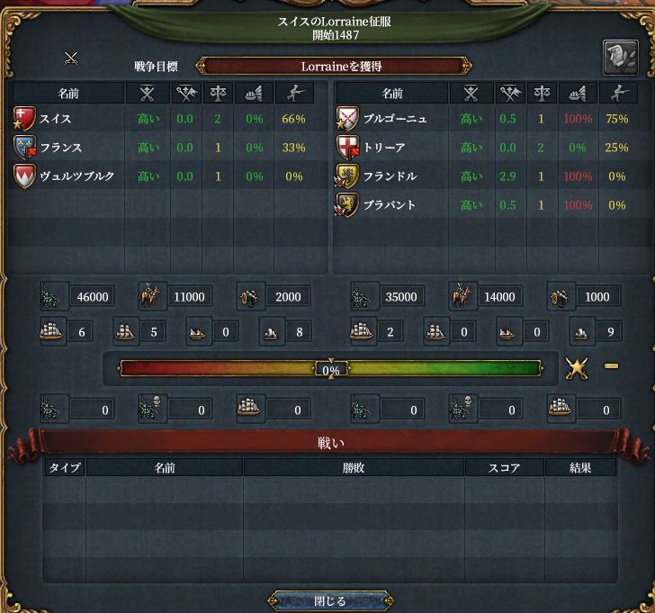 実はこの戦争、筆者がブルゴーニュから奪ったメッツに対して皇帝が返還要請を飛ばしてくると誤解して発生したものです。以前、アフターケアに行ったミラノ戦でプファルツの同盟網をぶち壊していたので簡単に倒せました。