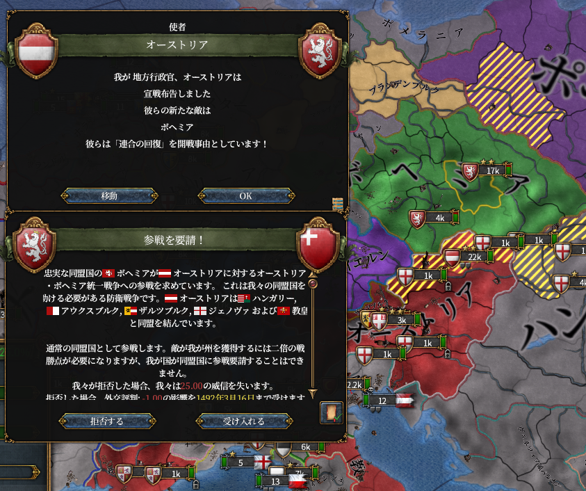 皇帝ではなくなったことでタガが外れたのかオーストリアがボヘミアへと侵攻、しかも同君CBです!戦力差的に同盟参戦は断念しました。くっそオーストリアめ調子に乗りやがって…。