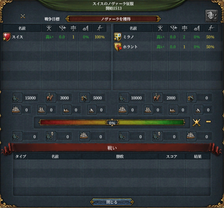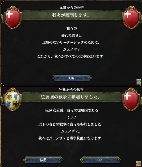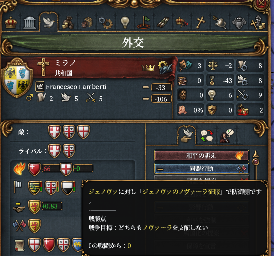 ジェノヴァ(カモ)がネギしょって現れたぜ。ジェノヴァは同盟国ですが属国(になる予定の)ミラノの旧領を不当に占領する*2領土欲に塗れた蛮族国家です。この際コテンパンにしてしまいましょう。