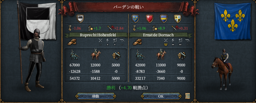 超優秀なアンドレ公が逝去しました。せめて君主点の足しにしようと強さを示してトリーアと講和。
