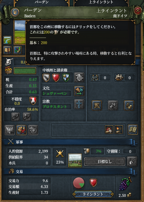 ここで交易ノードをラインラントに切り替えるためにバーデンに遷都(DLC不足により筆者のEU4には交易首都の概念はございません)。