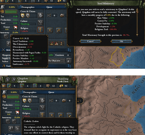 一つのプレイヤーチートじゃが、一旦Unrestを-6以下に下げ(下げすぎてはいけない)、宣教師を送ると・・・