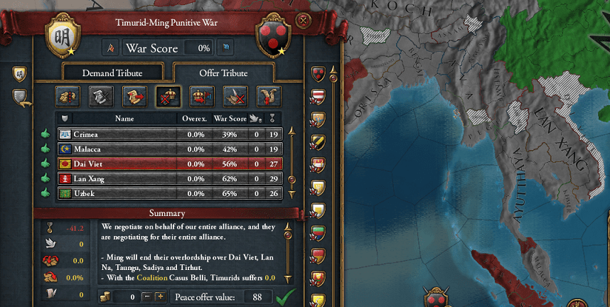 今回の包囲網戦争での損害は、概算すると君主点-24、人的資源-7400、威信-41.2・・・威信は朝貢国から搾れるから、ほぼ無傷と言っていいな、これ。