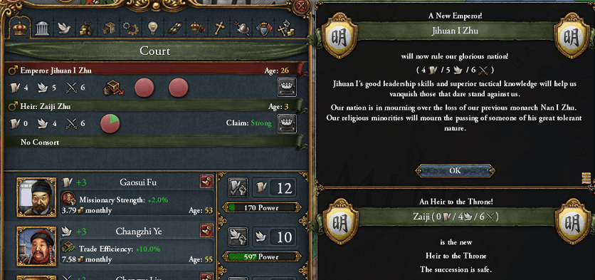 北京ノードは現状数少ない明の貿易収入の生命線じゃからの。終戦と同時に内政も動いたぞい。即位20年をもって景泰帝(3, 4, 1)が退位、成化帝(4, 5, 6)が即位された。皇太子朱載基はまた偏った脳筋のようじゃが、まあ良君の範囲じゃろうな。