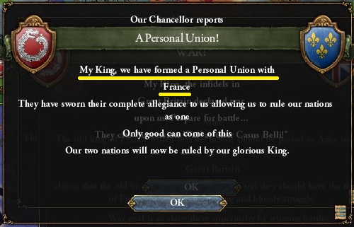 たとえば、v1.4時代ならばイギリスプレイで開幕百年戦争でフランスを同君下に置いた場合、それを維持して併合するのに特に問題はなかった。