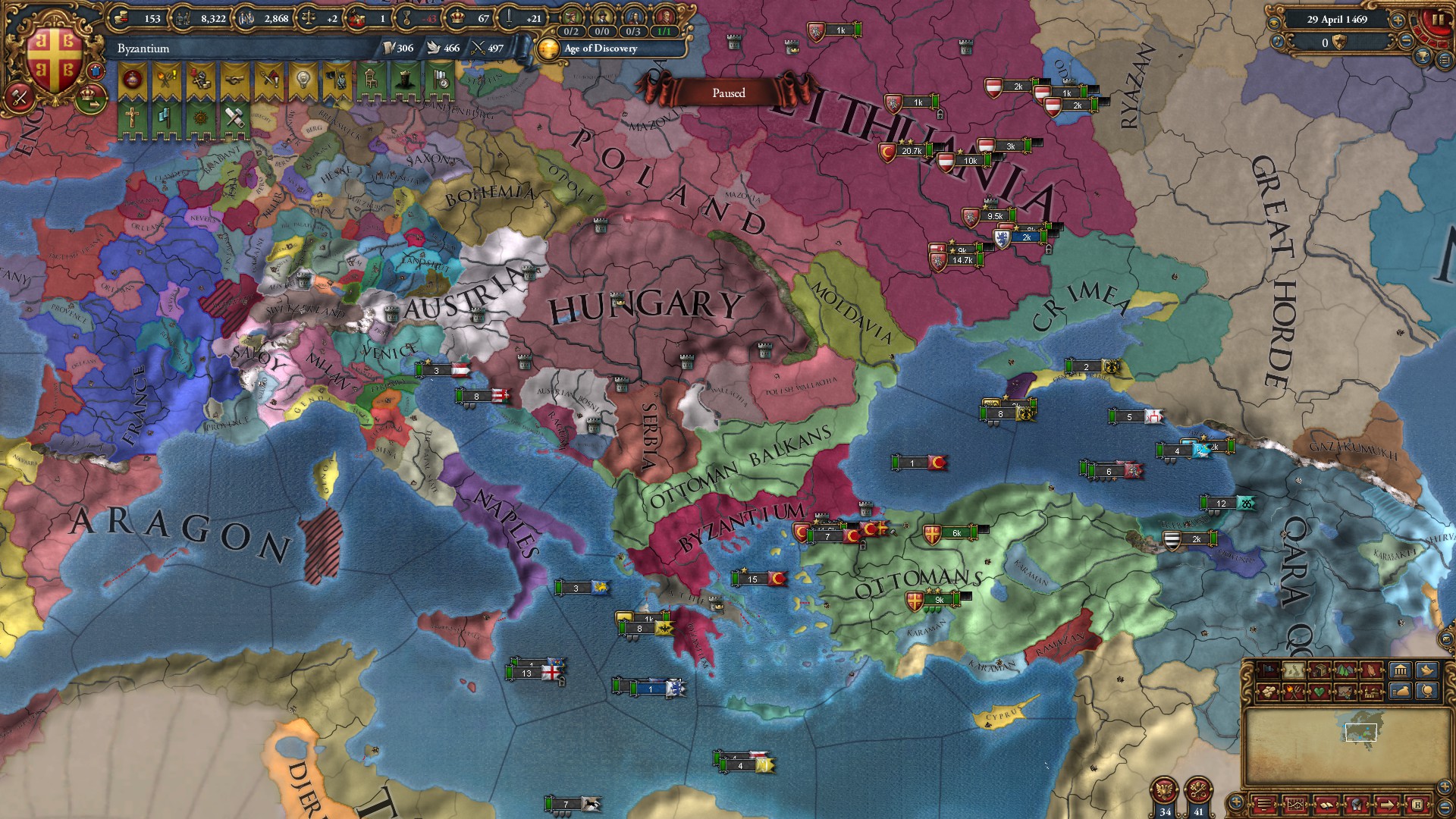 画像はビザンツのFLが14、同盟はオーストリアとリトアニア、オーストリア-ハンガリーの同君連合が成立しており、オスマンがマムルークと戦争している状況です。リサイズにより見づらくなっていますが、戦力はビザンツ側が歩兵71K騎兵14K、オスマン側が歩兵38K騎兵7Kです。これくらいあると非常に理想的ですが、オーストリアがフランスと戦争をおっぱじめたりオスマンがなかなか他国と戦争を始めなかったりして開戦時期が後ろにずれ込むことがよくあります。その時はアイルランドやスコットランドの侵略を進めたり別の国にNO CBして拡張したりしましょう。もしかしたら1500年代までかかるかもしれませんが、その時はExplorationで西アフリカに行ったりしてもいいかもしれません。アイルランドから行くにはDipTec7必要ですが。