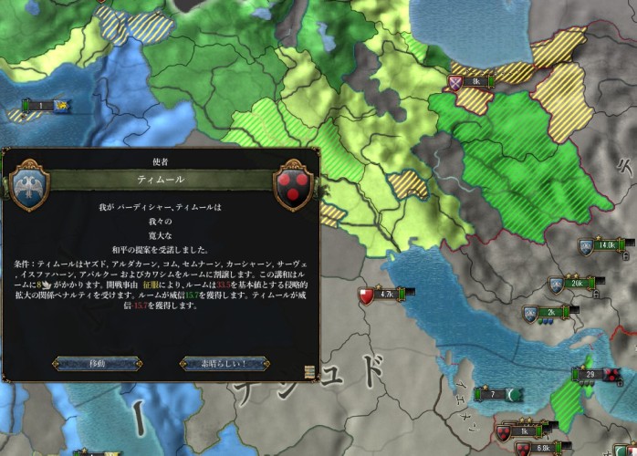 ティムールさんとの同盟を終わらせてペルシア征服に踏み出したぼくたち。味方は長いお付き合いのマムルークさんと、新しい友達ロシアさんです。