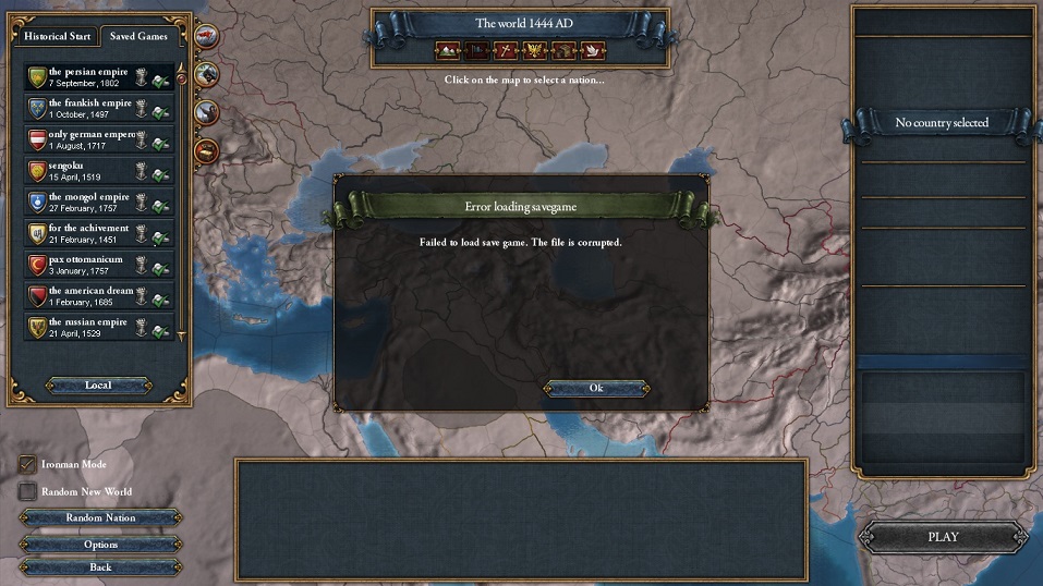 1800年までプレイして開始画面のスクショを撮るために戻ったらこうなったよー。他のデータはちゃんと読み込めるよ。もし解決方法がありましたらコメントくださるとうれしいです。2chとかで質問したいのですが、海外滞在なのでコメントできないのです。ごめんなさい。