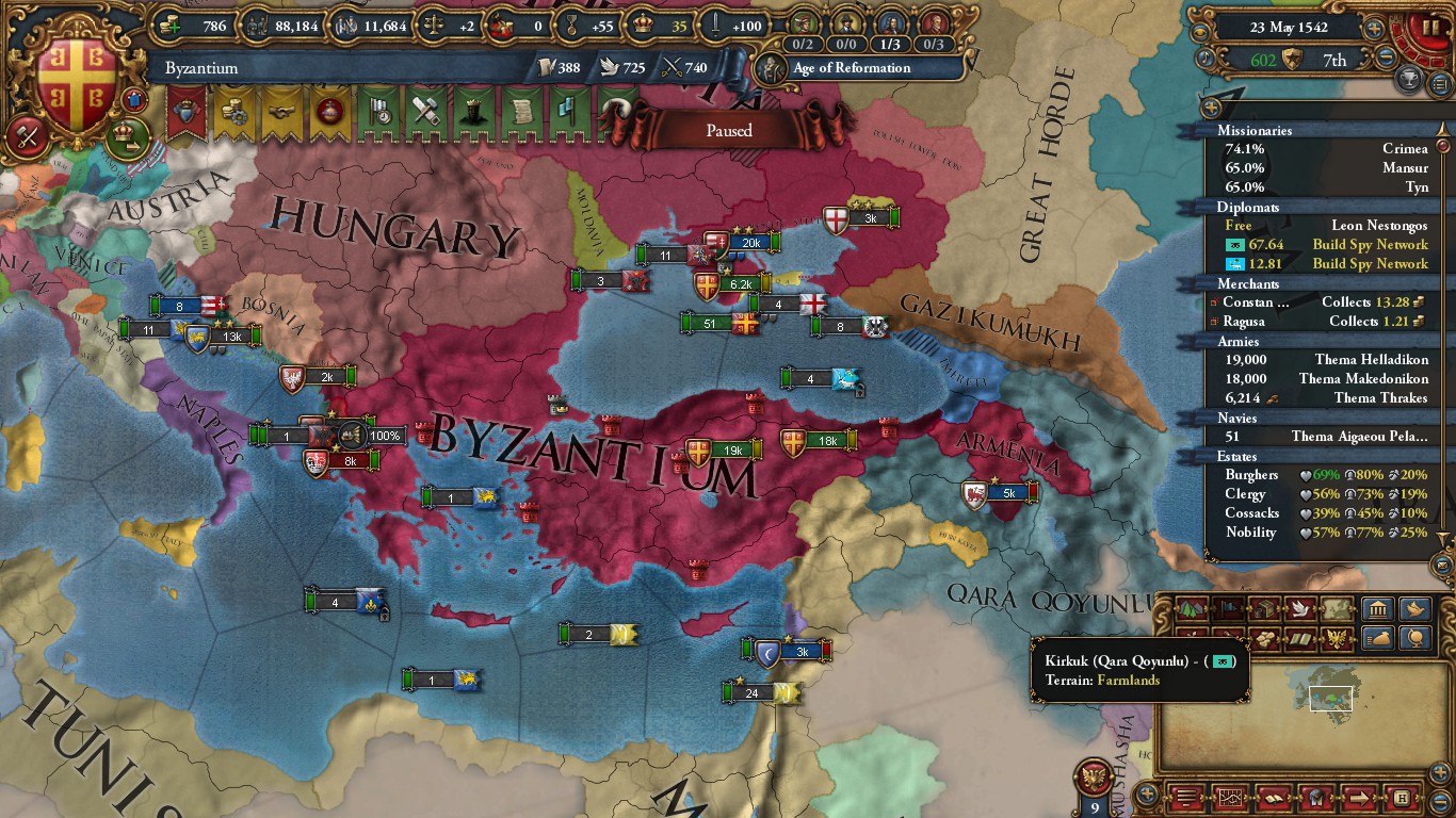 Basileus達成にはクリミア半島の2プロビも必要となるため注意、気づいたらモスクワの同盟国・属国になっていたりする。DLCのPurple phoenixを導入すればビザンツ専用の強力なイベントと大量のミッションを追加できるのでぜひ欲しい。ロシアと正教会を強化するThird Romeも重要だ。個人的にはビザンツでスムーズに拡張するには序盤で軍量などの軍事アイデアを一つとった方がよいように思う。