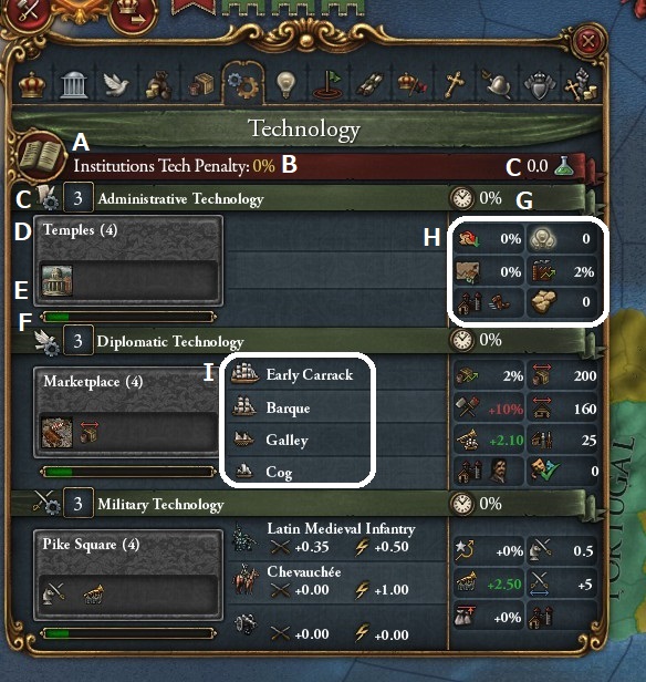 | A | 概要 / Outliner | 自国の、使節や軍の一覧。マウスオーバーで詳細を確認できる。 項目を左クリックで、その使節の派遣先や、軍の現在地に飛ぶ。右クリックで操作できる項目もある。 アイコンで、概要 / Outliner に表示される項目を自由に変更できる。進行速度の±アイコンの右二つのアイコンで、開閉できる。 |