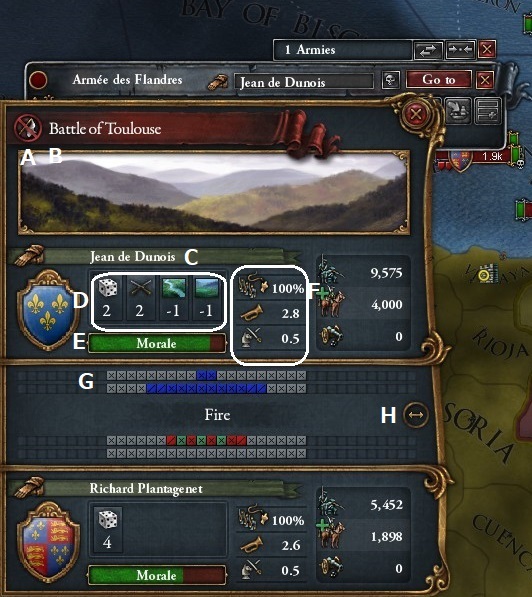 | H | 戦闘幅 | 軍事戦術によって変化する。戦闘幅よりも多くの連隊が存在する場合、戦場に投入されず予備兵となる。 |