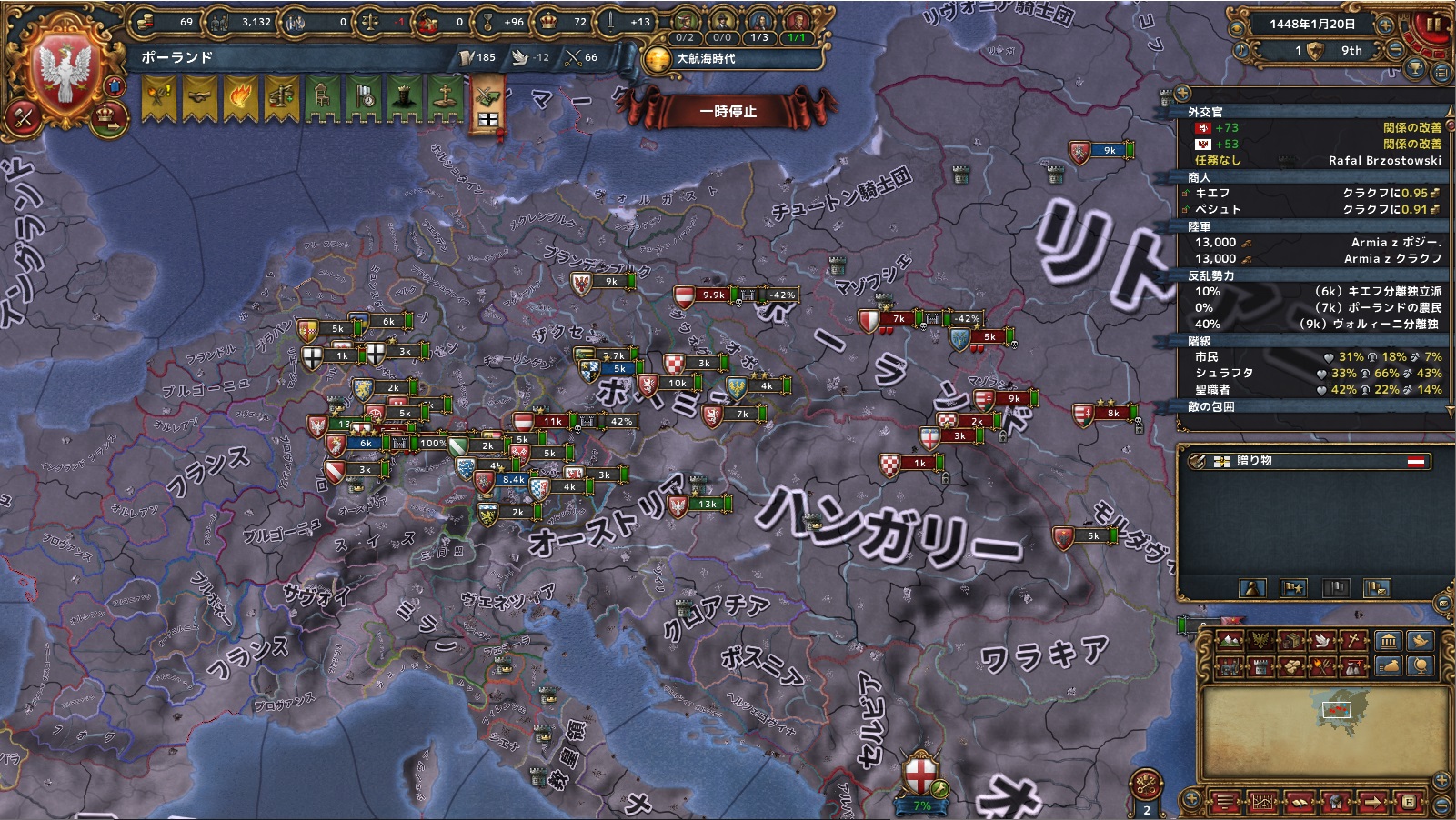 基本的にポーランド・リトアニア+αの国力は東欧の中でもとりわけ強力で、オスマン・HRE皇帝・モスクワ以外は一通り自由に殴れる状態と言っていいでしょう。