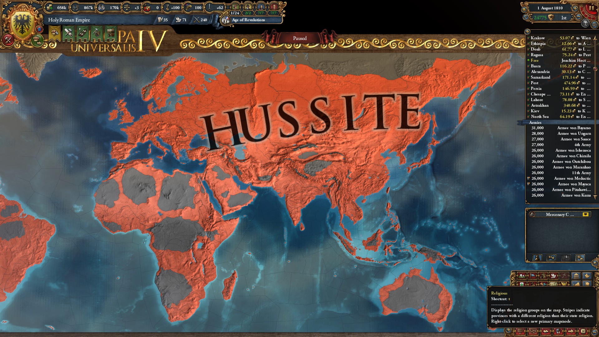 他は、ボヘミアのミッションに沿って同君連合増やしたり、ポントス・ロシア地方に向けてHRE領を拡張していく流れとあります。オスマンに死を