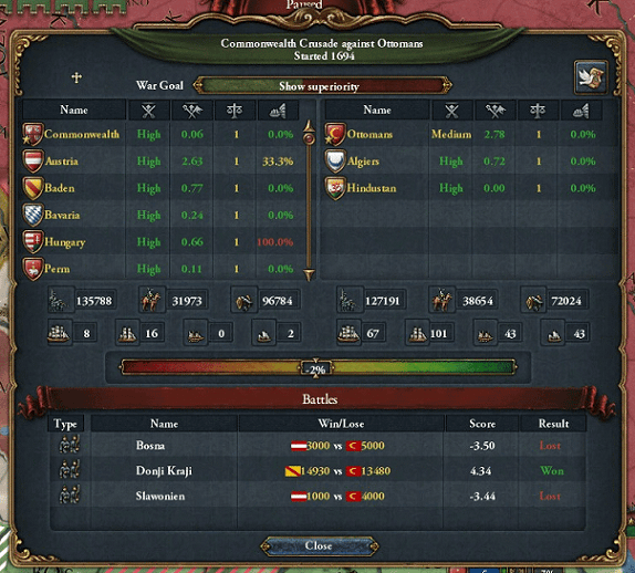 しかし、コモンウェルスはここで慌てて軍を引いたところでオスマンは講和に応じないであろうし、何より異教徒からの解放という大義を掲げながらすぐに軍を返したのでは両国及びハプスブルク家の沽券に関わるといってオーストリアの提案を拒否します。