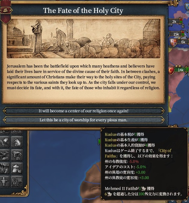 上を選ぶと支配者のadm+1とエルサレムのモニュメントのtierが1ランク上昇する
