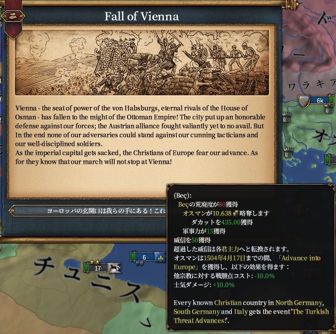 達成条件としては同盟を締結し、こちらへの評価150以上、信頼60以上で達成でき、この方法で達成するとクリミアはイベントで確実にオスマンの属国になります。