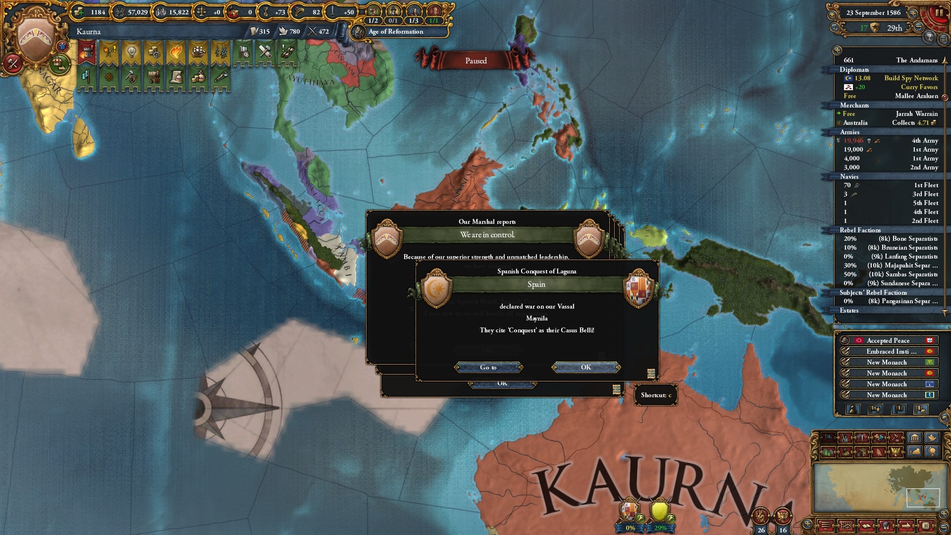 1586年、マラッカを攻めるため同盟を破棄したところでスペインに宣戦されました。ミッションで得られるフィリピンへの恒久的請求権を使ったっぽいですね。