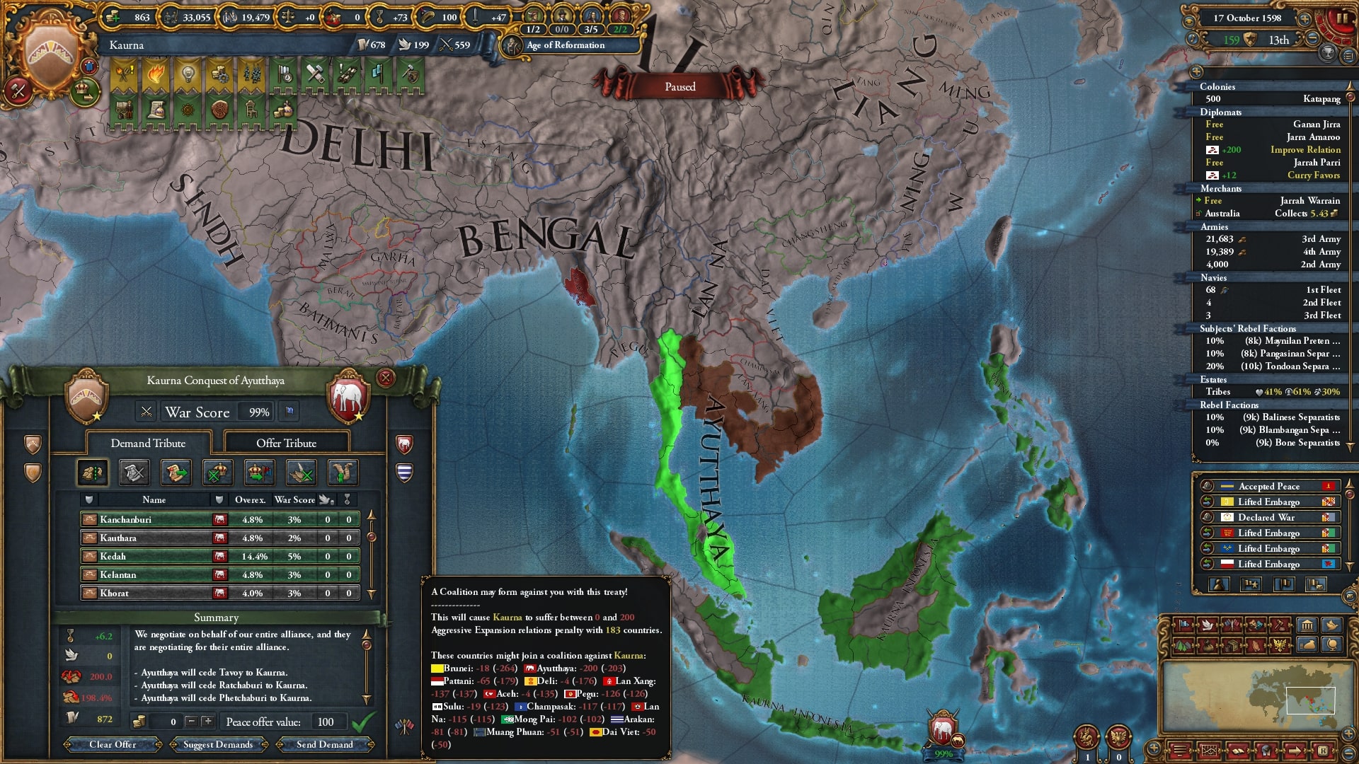 マラッカ撃破の流れでアユタヤ撃破、東南アジアの大陸部に進出。ベンガルやチャガタイと同盟しスンニ側のAEを抑え、東アジアは全国家殴るのでAEは無視します。
