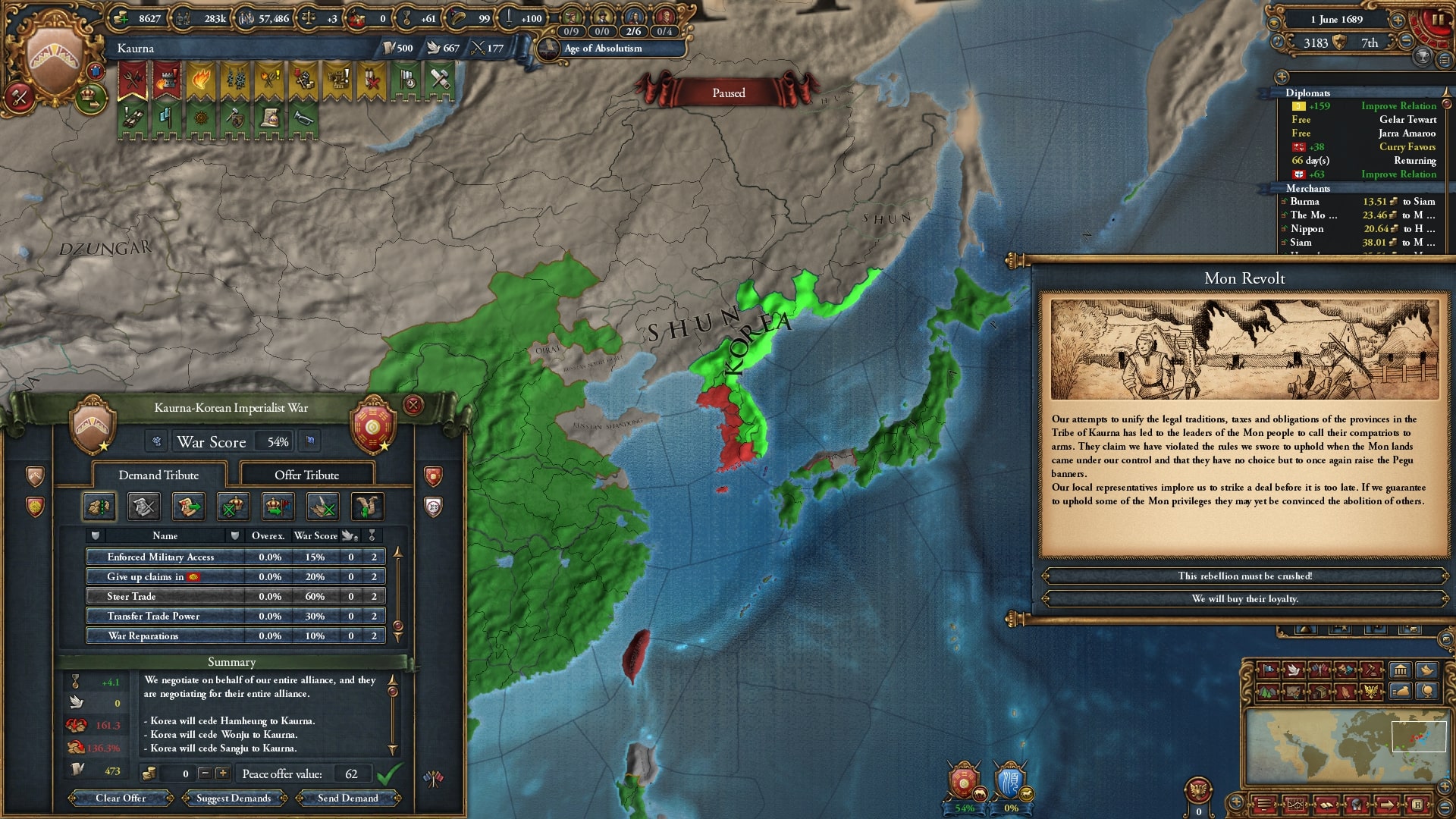 最近では絶対主義の時代あたりに内政の時間を作って革命の時代でのラッシュに備える、というAARをよく見るようになりました。これらを参考に侵攻の計画を練り直し。中華をある程度侵攻した1650年から、帝国主義CBが利用可能になる1685ほどまでを内政期間に充て、建造物や交易会社に投資をして国力を底上げすることにしました。場合によっては借金を大量にして破産することも視野に入れておきましょうか。これで上記のラッシュを行う国力を作ります。