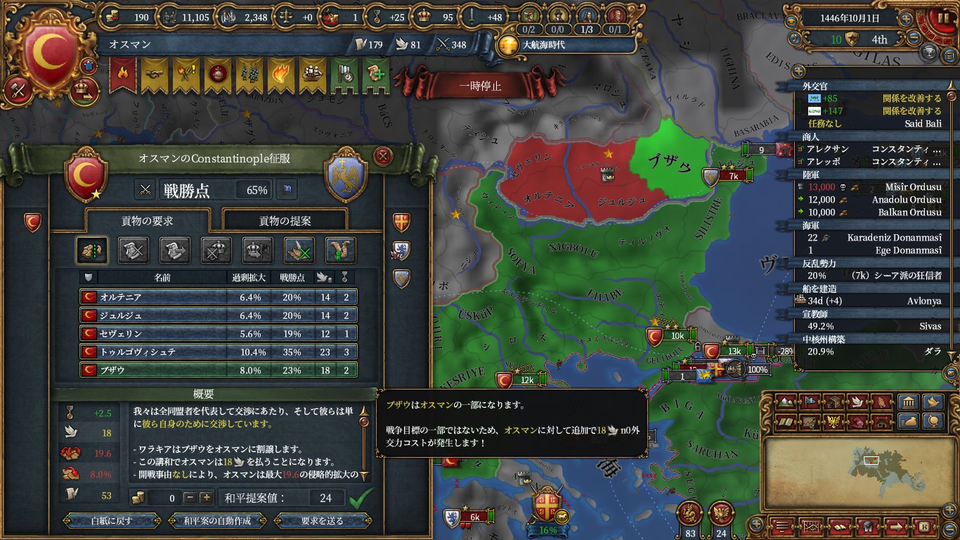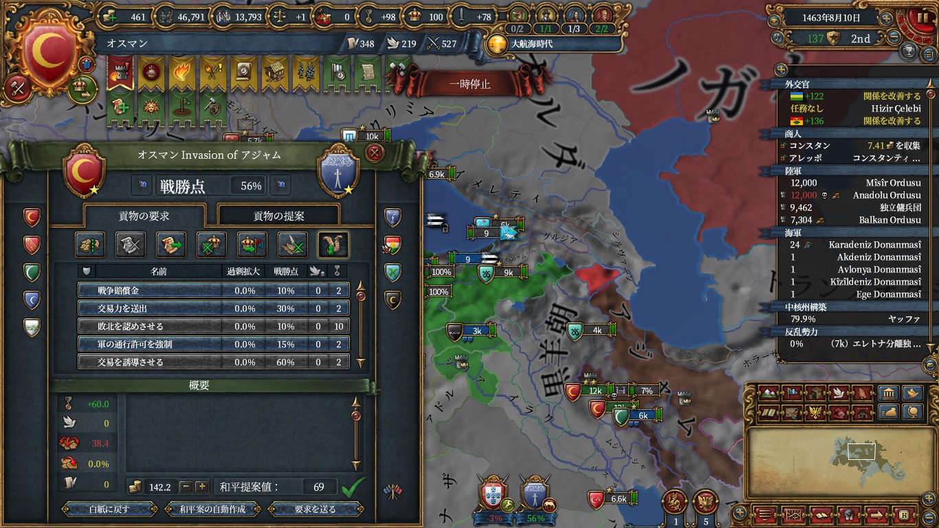 ミッション報酬で得たチュニスエヤレト化cbでチュニスエヤレト化後、アナトリアのアジア部分に遷都。交易首都はコンスタンティノープルノードに。