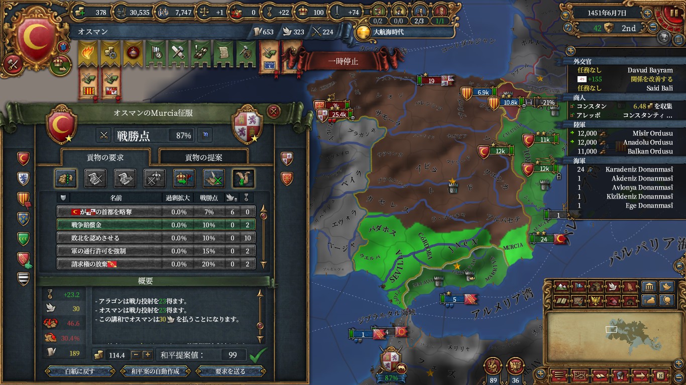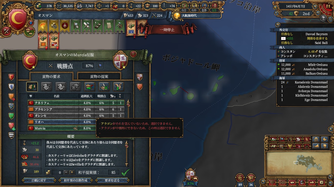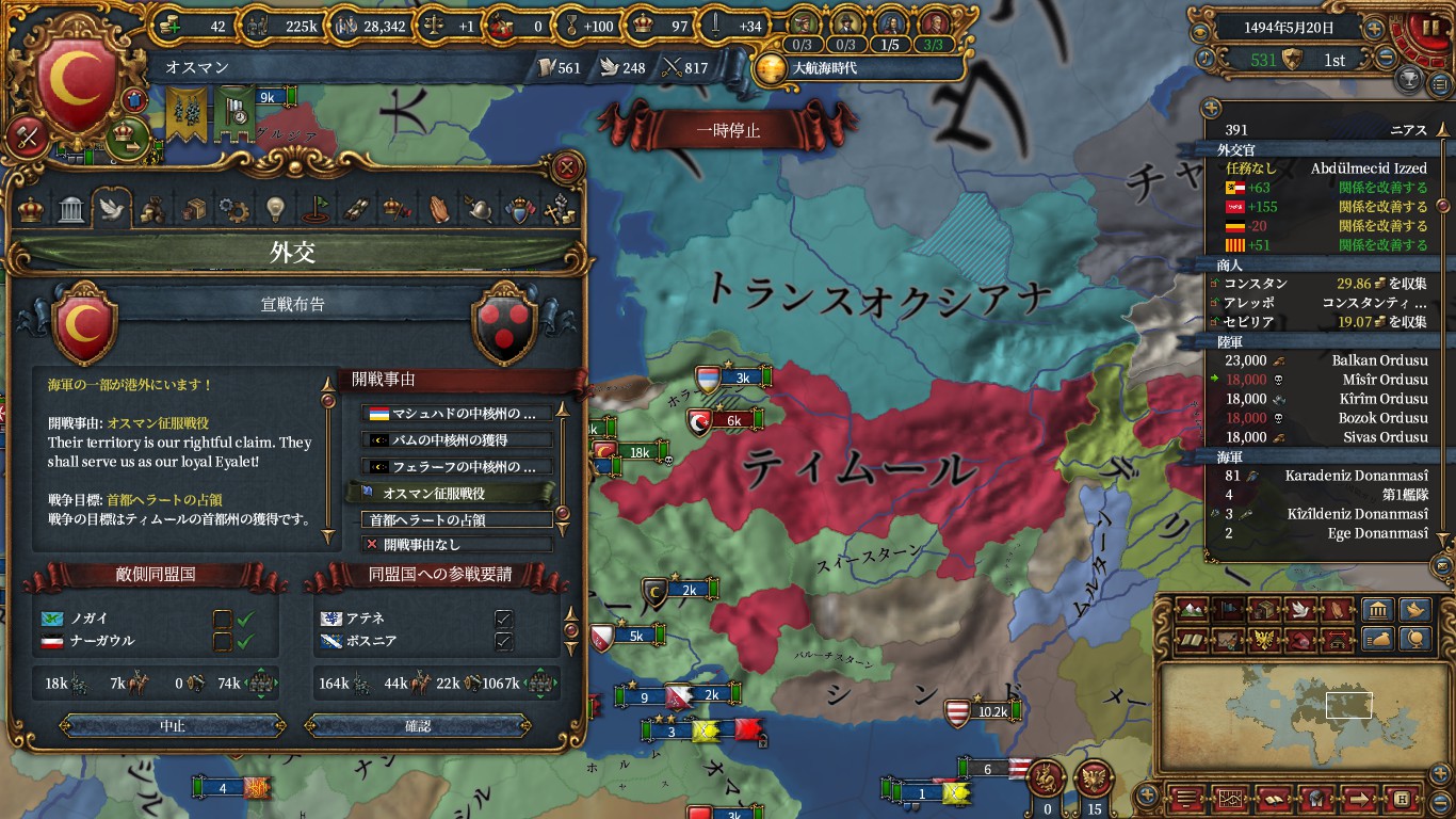 ただ、オスマンで植民するなら、探検取る前のポルトガルに宣戦でも良かったかもしれないです。フランスを呼び出しました。