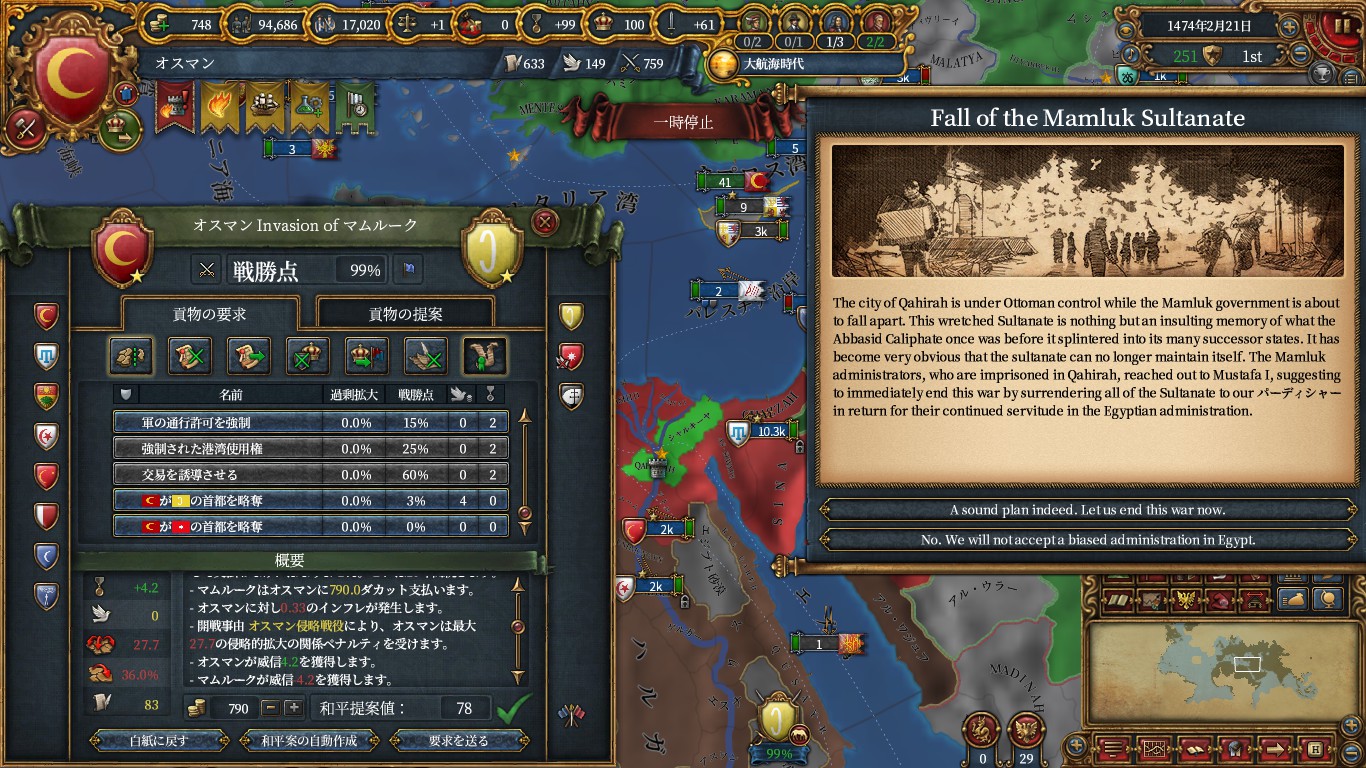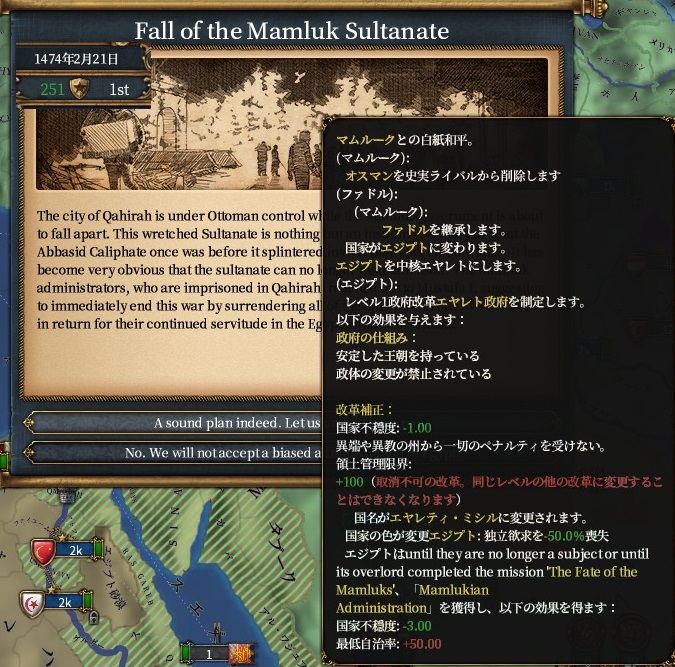 白洋から得たマシュリク地域の州と合わせて6州になったのでマムルークの打倒ミッションが達成できます。